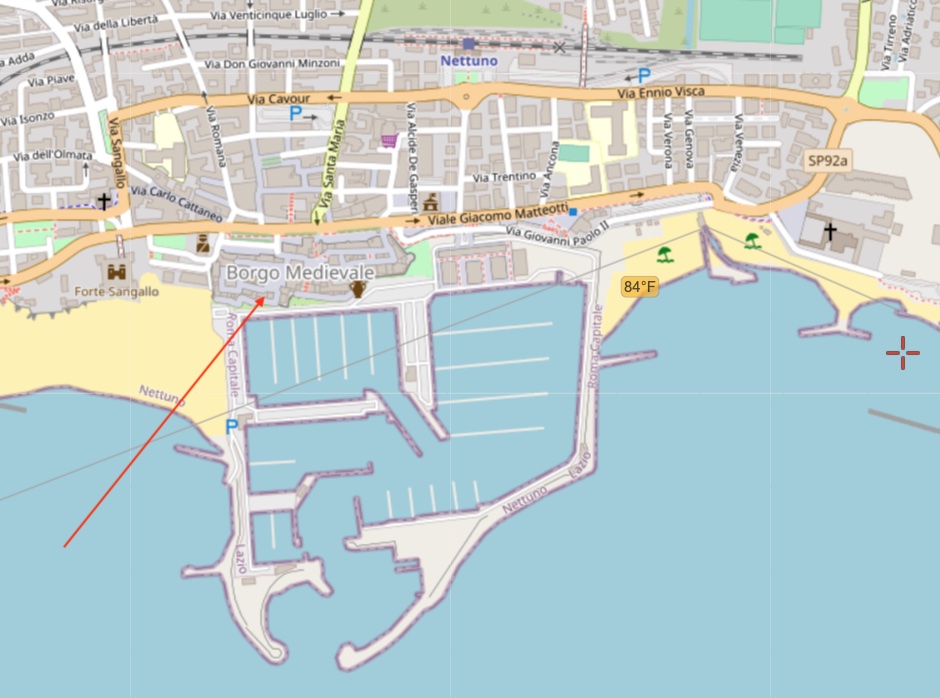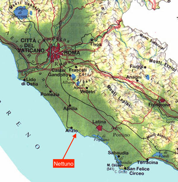 Nettuno is 60 kilometers south of Rome (just south of the picturesque fishing town of Anzio). The coast between Anzio and Nettuno is known for being the April 1944 WWII beach-head for the liberation of Rome. Just to name a few, day trips from Nettuno could certainly include Rome - and might also include visits to the castles of Sermoneta, the wine towns of Frascati, Marino and Velletri, the neolithic walls of Norba, the gardens of Ninfa, the national park at San Felice Circeo, and boat trips to the islands of